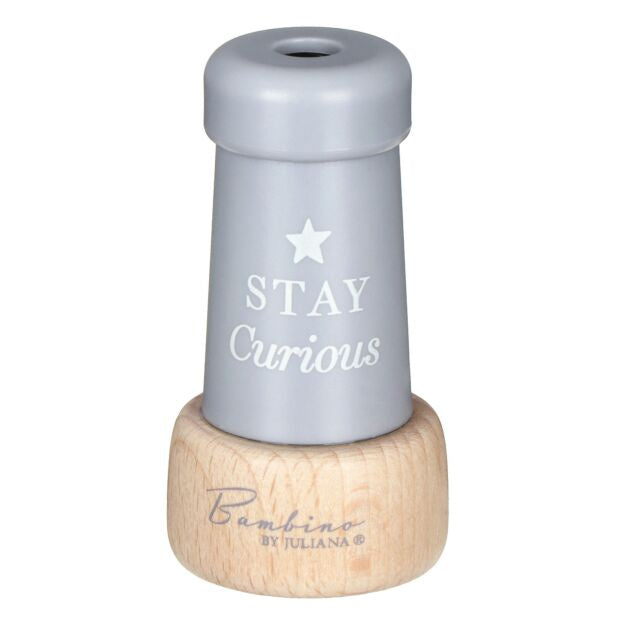 Place your eye to the hole at the end and gradually rotate the wooden tube to see colourful patterns change shape. This delightful wooden toy is grey in colour with text that reads ‘Stay Curious’, on the reverse side is an illustration of a moon and stars.