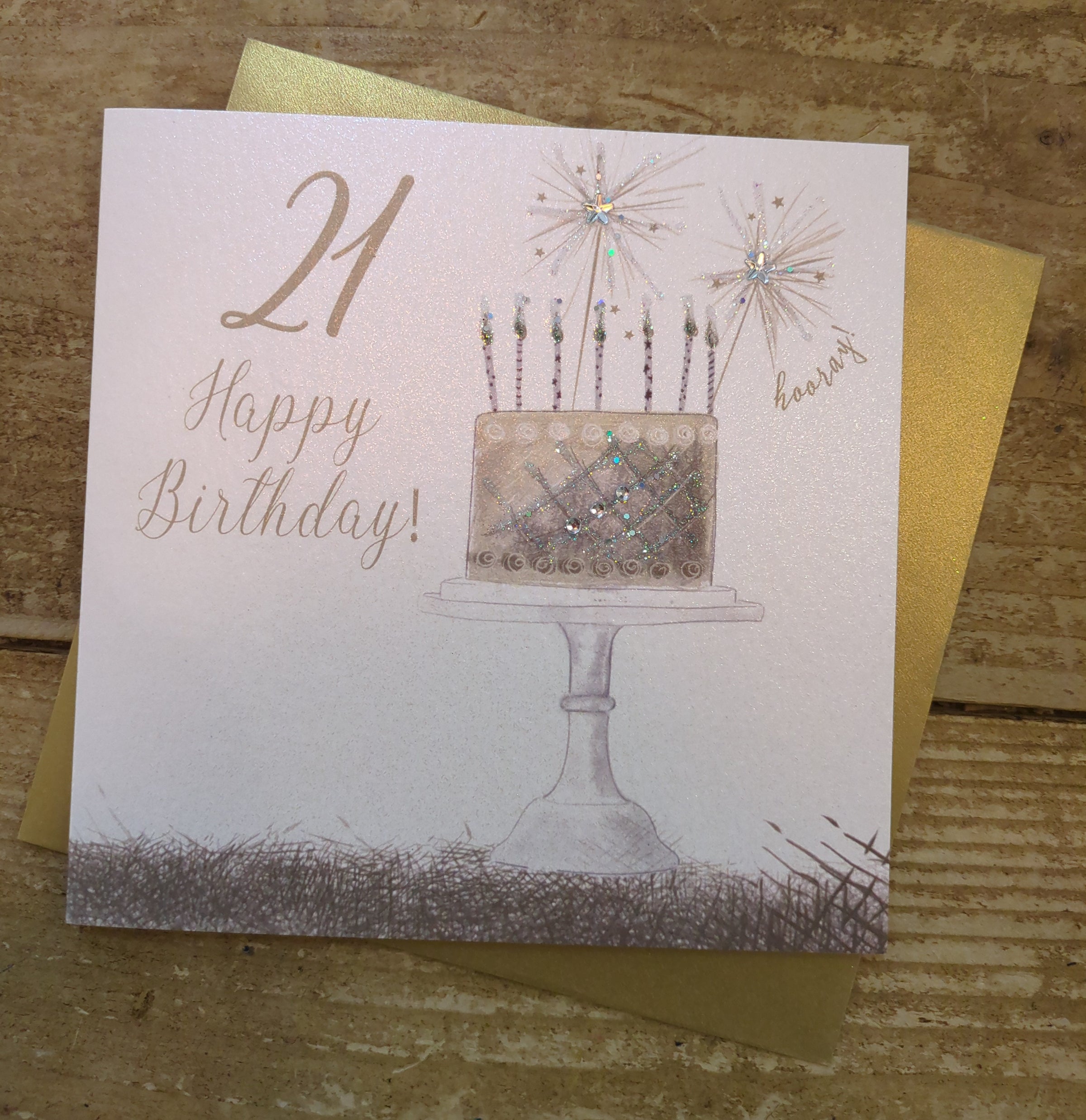 Age 21st Birthday Card: Cake on Stand Sparklers Hand Finished Crystals & Glitter - Gold - White Cotton Cards - A gorgeous card, hand-decorated, on a high quality card. Blank inside for your own personal message. Dimensions: 16X16 cm