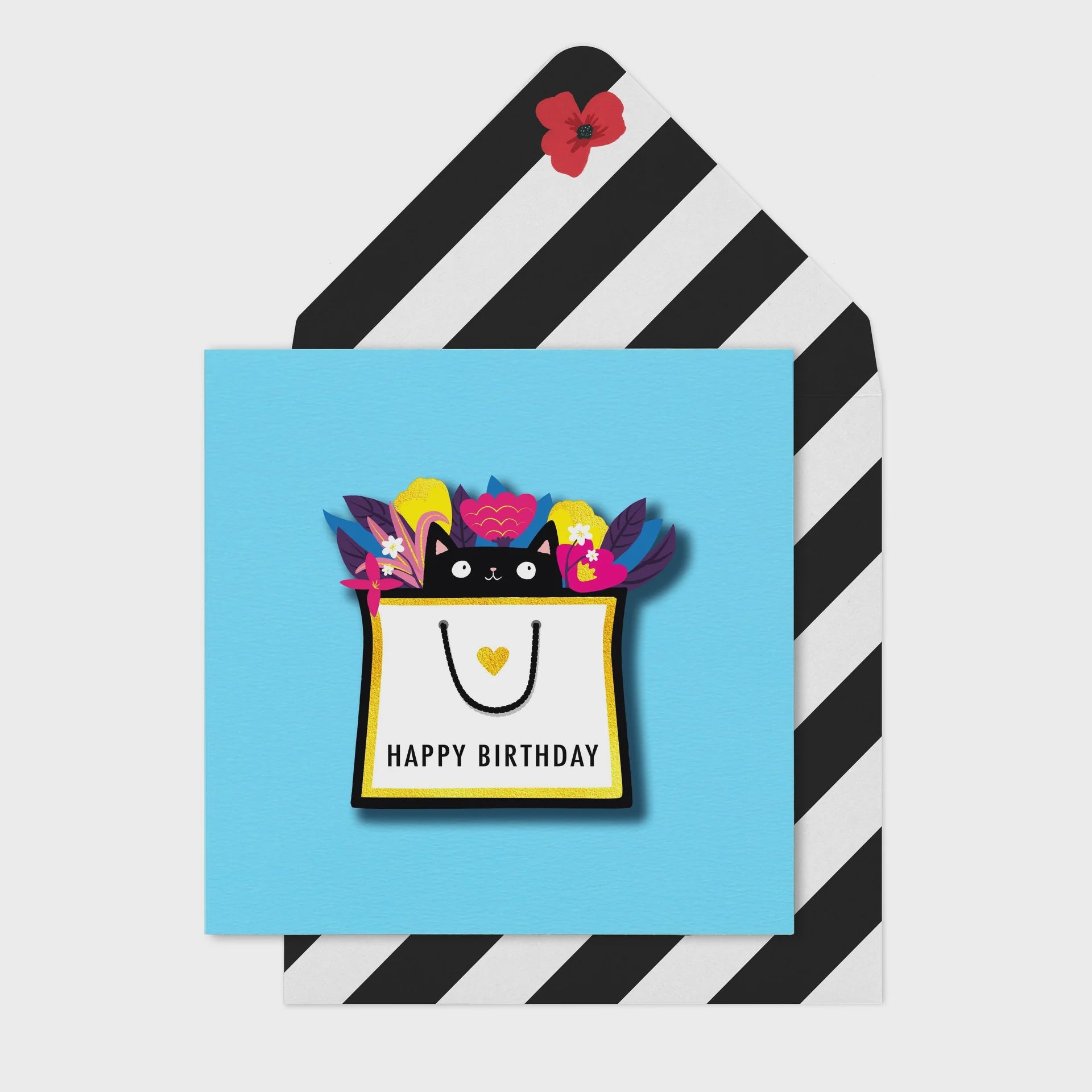 Birthday Card: 3D Happy Birthday' Cat in Bag - Tache - 3D card, handmade in the UK, Comes with a matching printed envelope, Luxury 350 gsm Board, Blank inside for your own message Dimensions: 175 x 140 mm