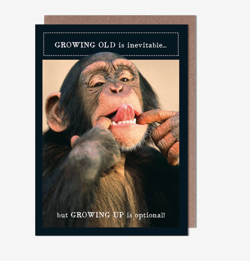 Card: Monkey Growing Old Inevitable Animal Antics - Pigment - Animal Antics Range from Pigment finished in spot uv. A fun colourful range of funny animal based cards. 280gsm Card and 100gsm Envelope. Designed and printed in the UK Dimensions: 130x230
