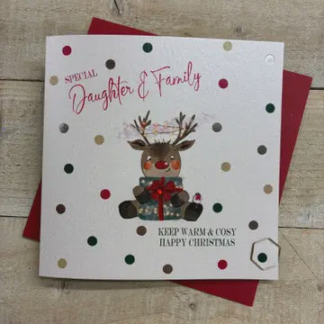 Christmas Card: Daughter & Family Dotty Reindeer - White Cotton
