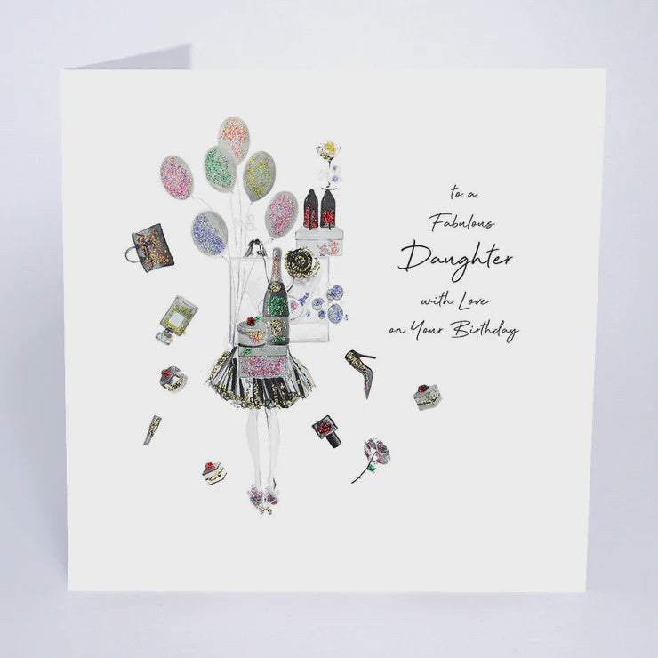 An exquisite range of Relations Birthday cards. Chic but fun, our elegant and oh so very Five Dollar Shake monochrome Daughter Birthday illustration is brought to life with hand-painted sparkling rainbow glitters.