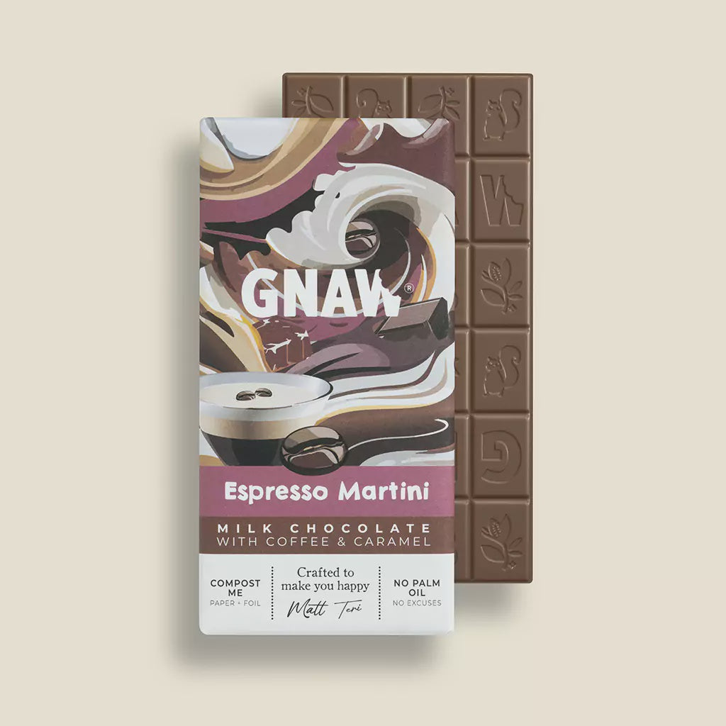 Chocolate Bar: Milk Chocolate Espresso Martini - GNAW - GNAW CHOCOLATE ...Just the good stuff, always. They make top-notch chocolate. Real ingredients. Well-paid cocoa farmers. No palm oil, ever. Just the good stuff. Always. Then there's the packaging. They use fully home compostable paper and foils. Plus, everything is made inside their futuristic solar-powered factory. They make great flavoured chocolate. And believe it shouldn’t harm anyone. Dimensions: 80g 36% Cocoa min