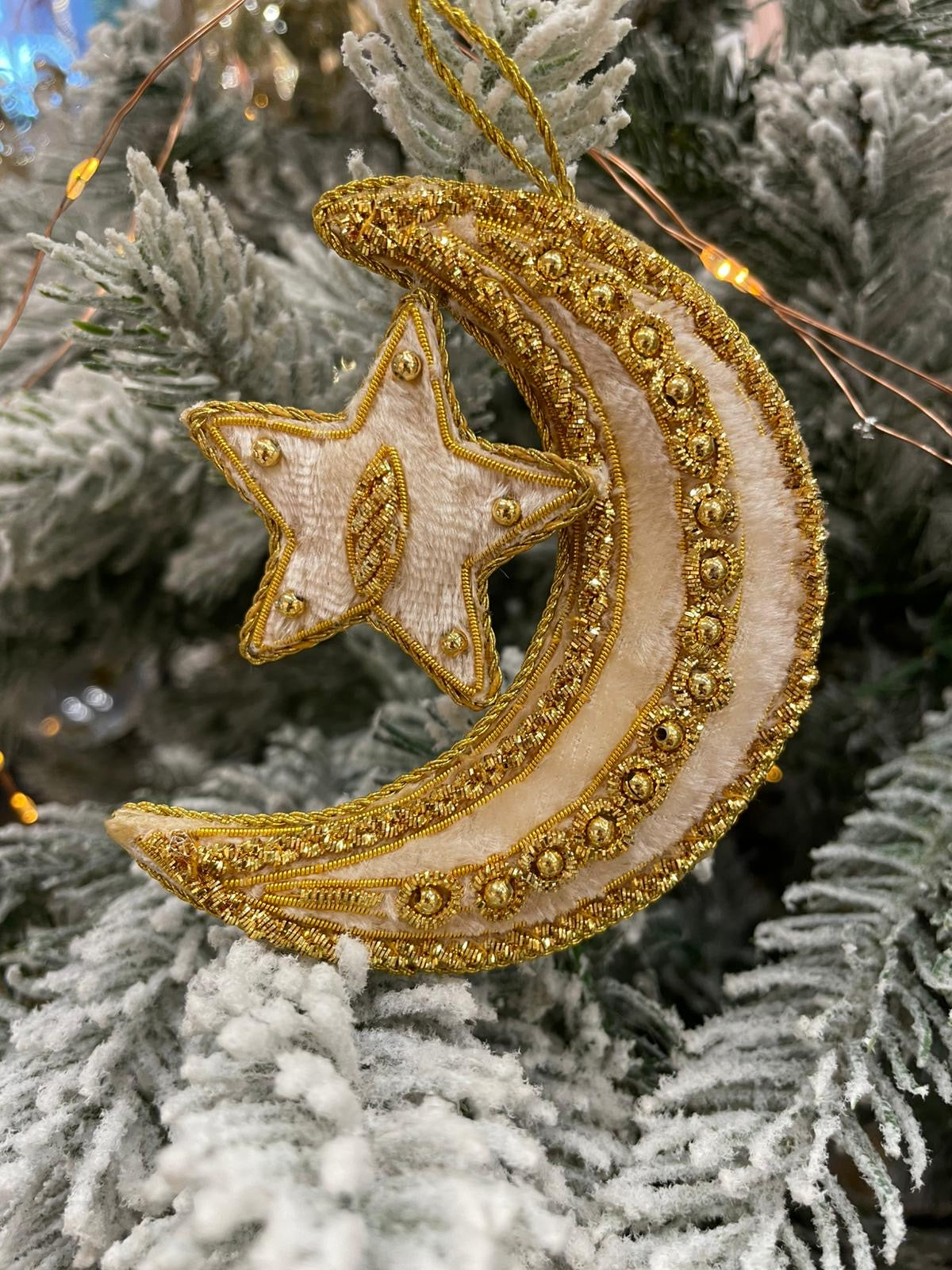 Christmas Tree Decoration: Velvet Beaded Hand Finished Moon & Star - Cream & Gold