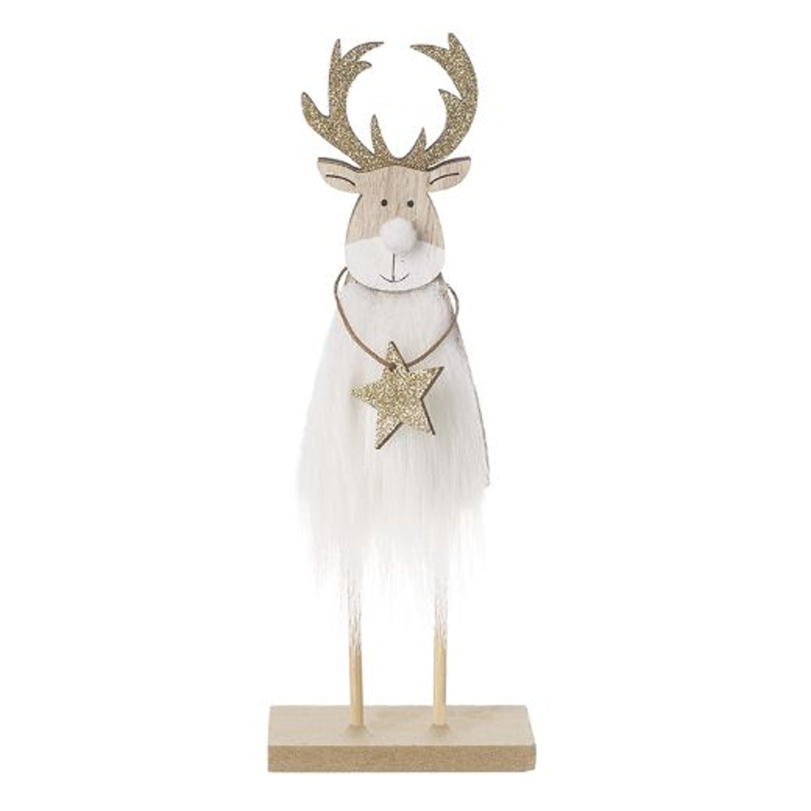 Ornament : Wood Reindeer Fluffy Star WONDERLAND - White & Gold - 22x8cm
