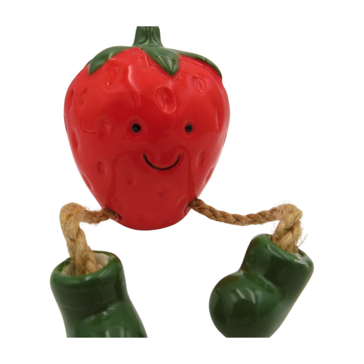 Ceramic strawberry shelf sitter with fun face and rope legs