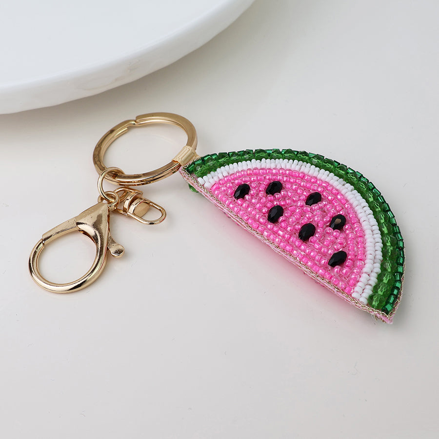 Embellished watermelon slice bag charm and keyring with beads in green, black, white and pink on a golden keyring with lobster clasp