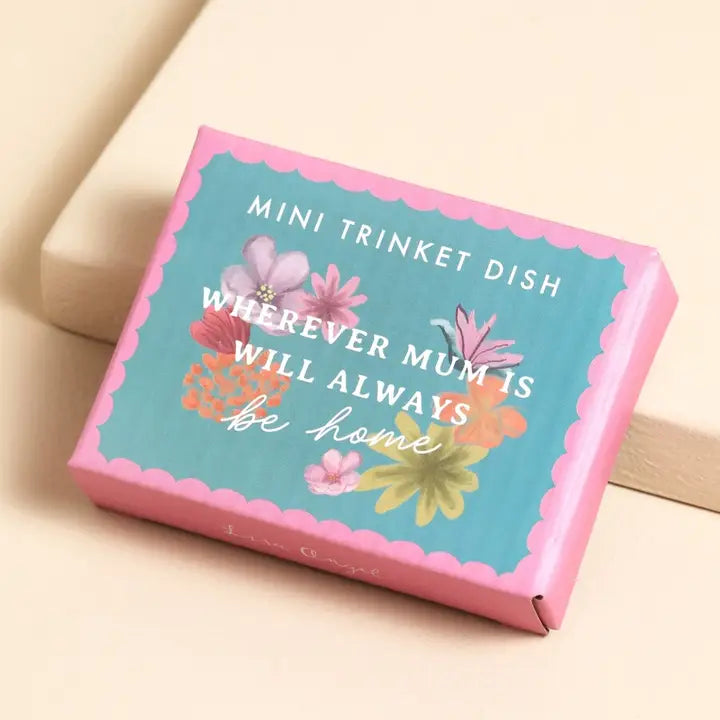 Wherever Mum Is Will Always Be Home" trinket dish Blue and pink colour scheme with ridged edges With floral illustrations for a vibrant touch Perfect for storing small accessories, coins, or trinkets The text reads 'Wherever Mum is will always be home'