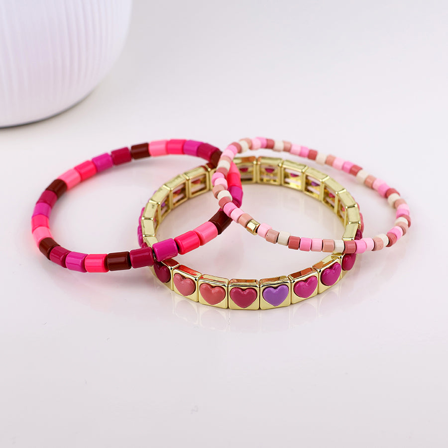 Triple bracelet stack with mixed stretch bead bracelets in shades of pink, red, purple and cream and a faux gold plated square bead bracelet with inset hearts
