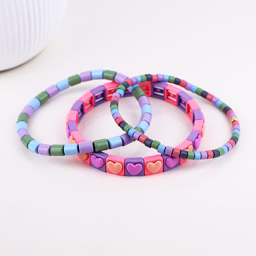Triple bracelet stack with mixed stretch bead bracelets in shades of lilac, pink, blue and green and a square bead bracelet with inset hearts