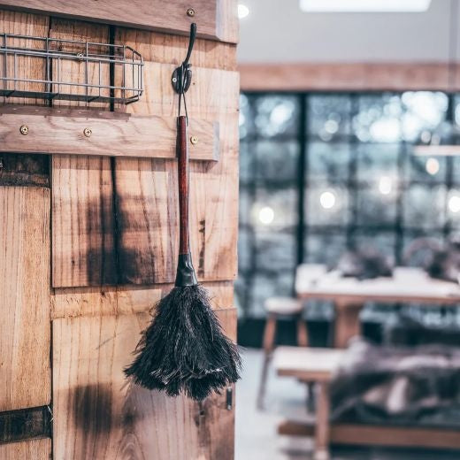 A traditional ostrich feather duster measuring 50cm long with a varnished wooden handle set with dark ostrich feathers. Whips around the house quickly capturing dust ensuring you don't waste time spreading dust but remove it effectively from ceilings, light fittings, ornaments, furniture and stairs. Perfect for a speedy dust around the house when you have better things to do! Good for sensitive things: Ostrich feather dusters are particularly lightweight, which is why they are especially well suited for dusting delicate items or smaller pieces that tend to topple over easily.