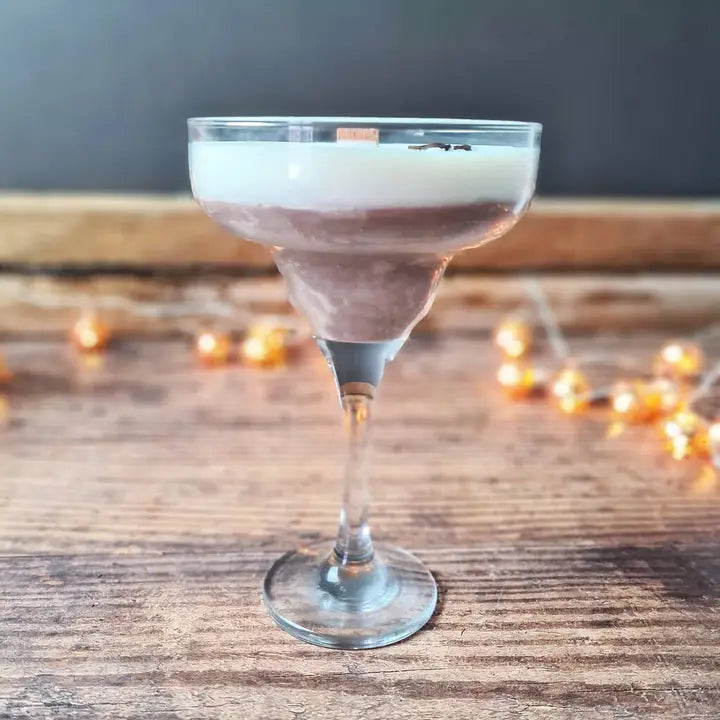 The soy wax is hand poured into one of our gorgeous margarita cocktail glasses to create an artistic candle in the image of an espresso martini cocktail. The candle's burn time is approximately 60 hours and the scent throw (the amount of scent that fills the room) remains excellent throughout.