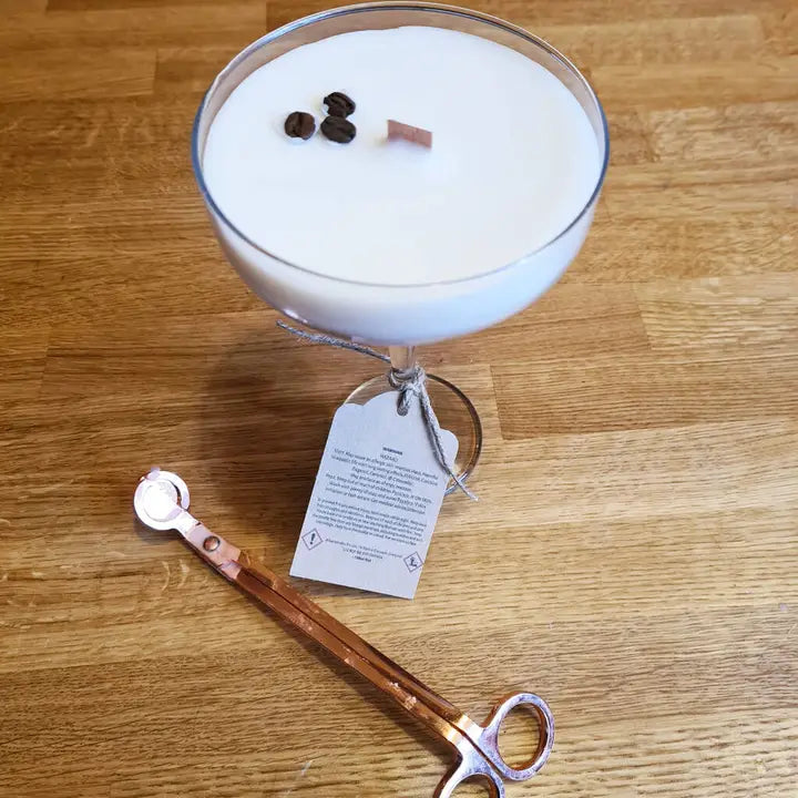 The candle is designed to resemble a classic espresso martini with real coffee bean garnish. The scent is strong brewed, iced espresso coffee blended with alcoholic notes of vodka and coffee liqueur.
