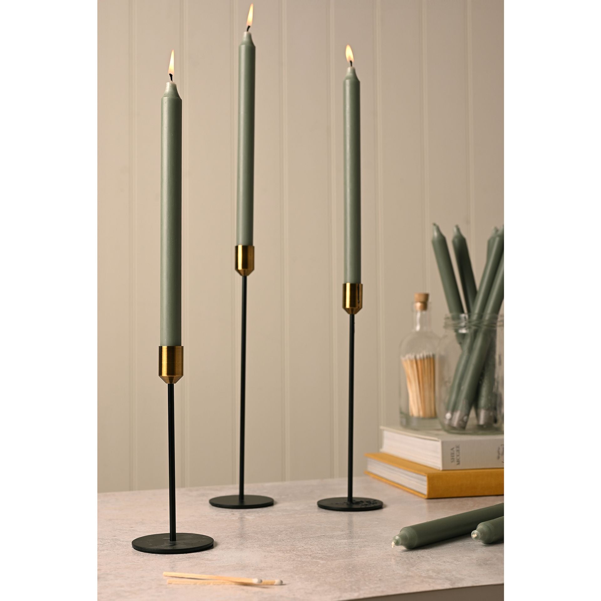 Taper Candle: Unscented 12" Eucalyptus - Eucalyptus Green - Northern Lights - This Northern Lights 12-inch Taper Candle, available in a selection of vibrant colours, burns for approximately 13 hours. Smokeless, dripless, and unfragranced, these tapers contain 30% more wax due to their straight sides, ensuring a clean, steady burn. Dimensions: 295 x 25 x 25mm