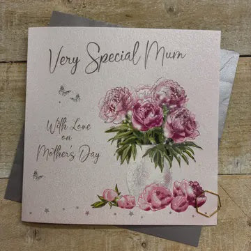 Mothers Day Card: Peony Very Special MumHand Finished Crystals And Glitter - White - White Cotton Cards
