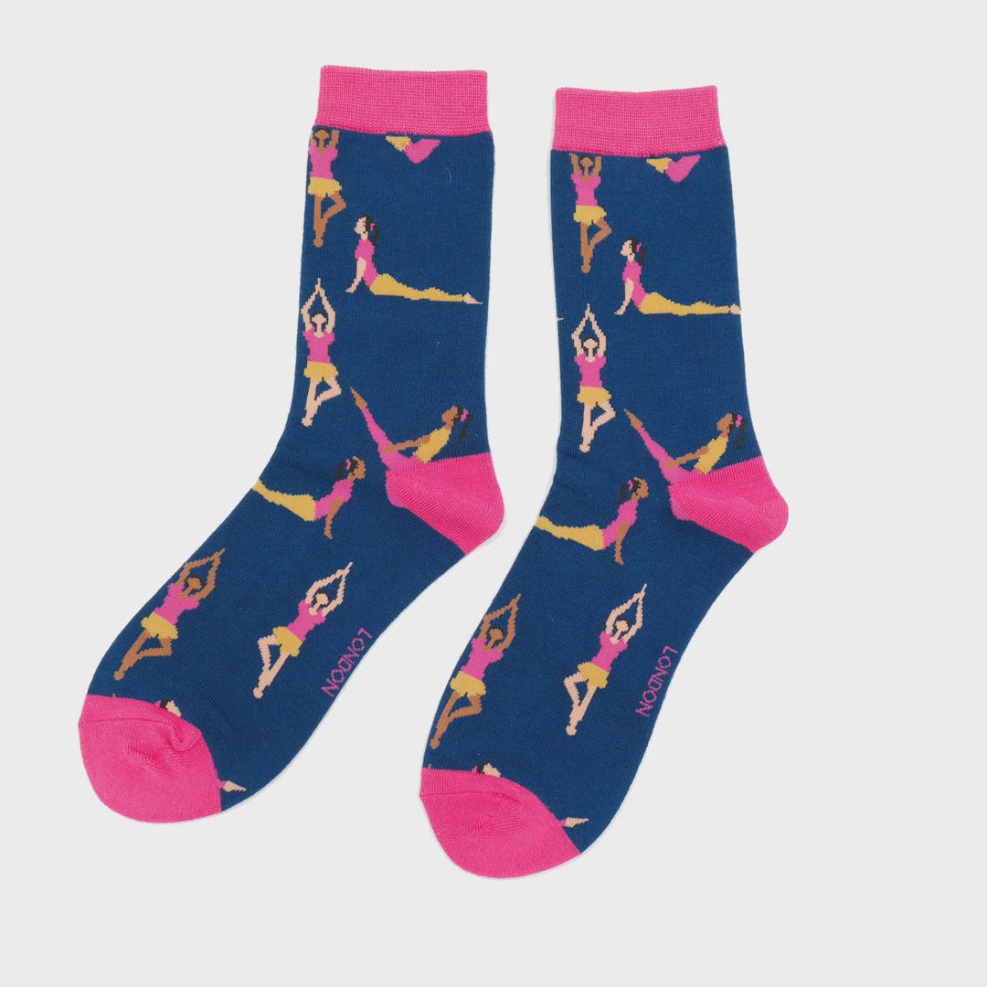Ladies Socks: Bamboo Yoga Poses - Navy - Miss Sparrow
