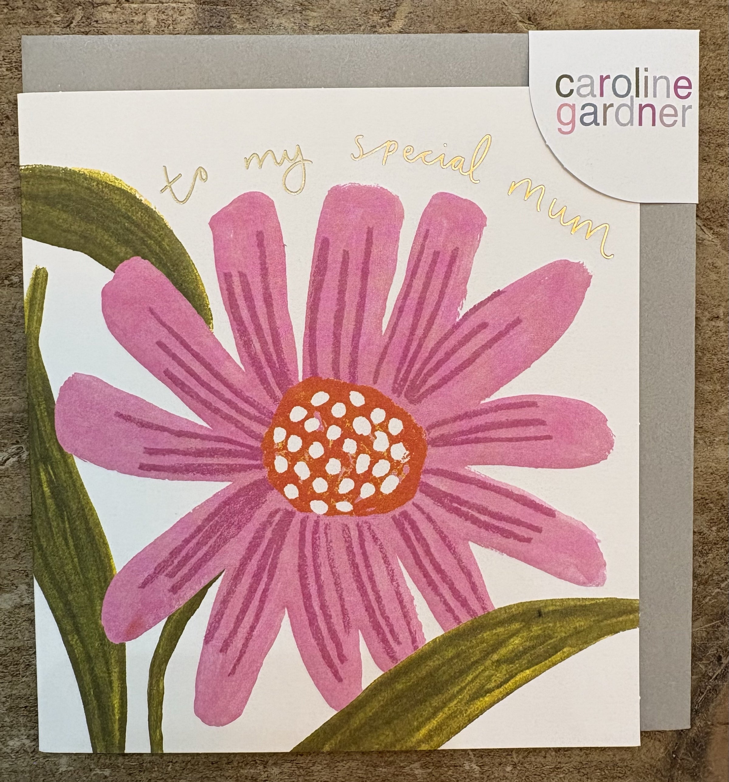 Mum Card: GOLD FOIL Mum Big Painted Pink Flower Embossed - Caroline Gardner