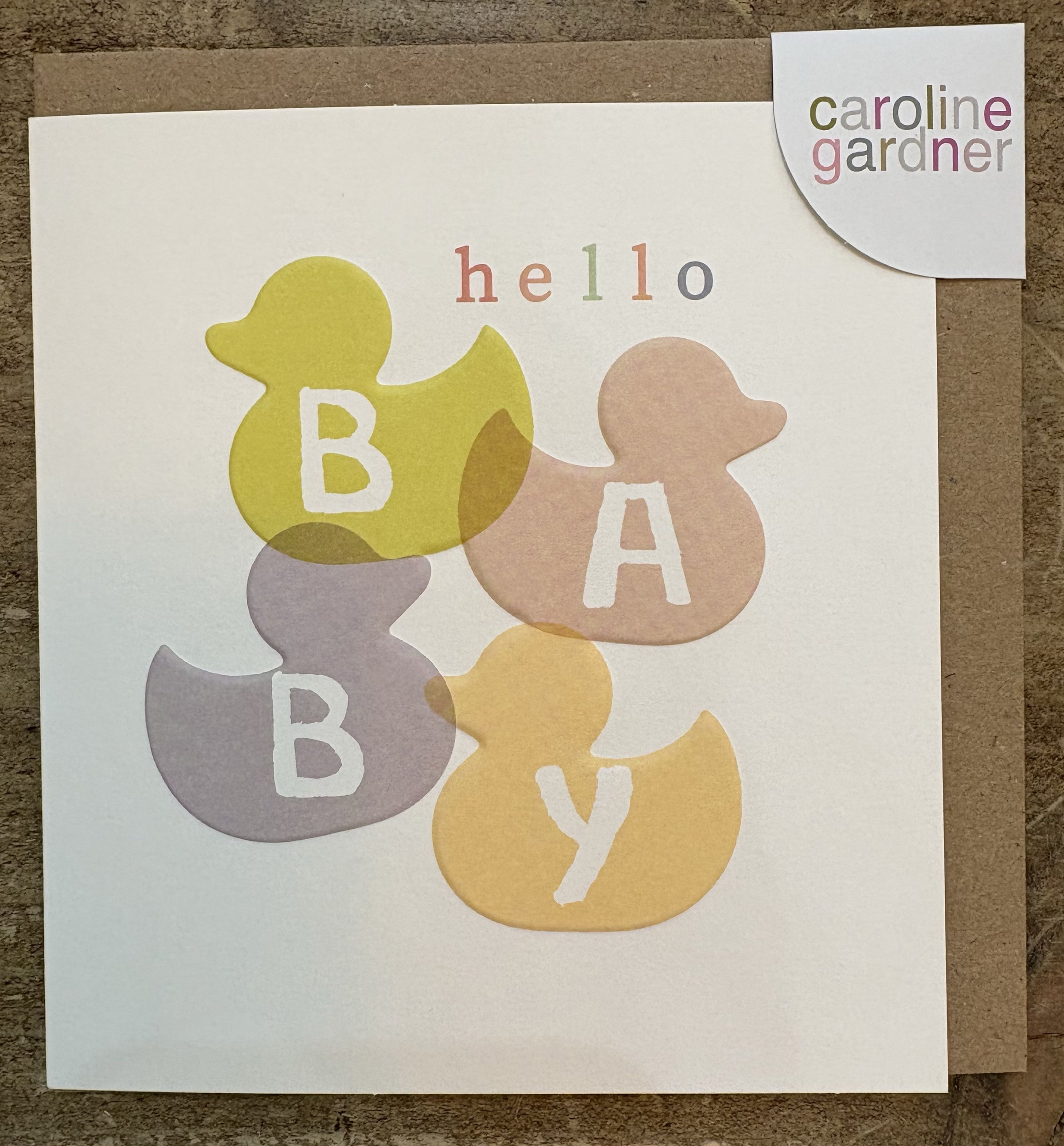 New Baby Card: GOLD FOIL Hello Baby Rubber Ducks Embossed - Caroline Gardner - Colourful and bold borders are paired with fun, illustrative icons in our new 'Border' range. Features hints of gold foil and embossed finishes, supplied with a kraft envelope. Dimensions: H146 x W140mm