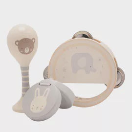 Introduce a little one to the world of music with the Bambino by Juliana® Wooden 3pc Music Set. This delightful set includes a maraca, castanets, and a tambourine, specially designed for tiny hands to explore and create playful rhythms. The whimsical animal illustrations add a touch of enchantment to the musical experience, capturing the imagination of little musicians. This item is a delightful and educational addition to any young musician's playtime. Closed box packaging.