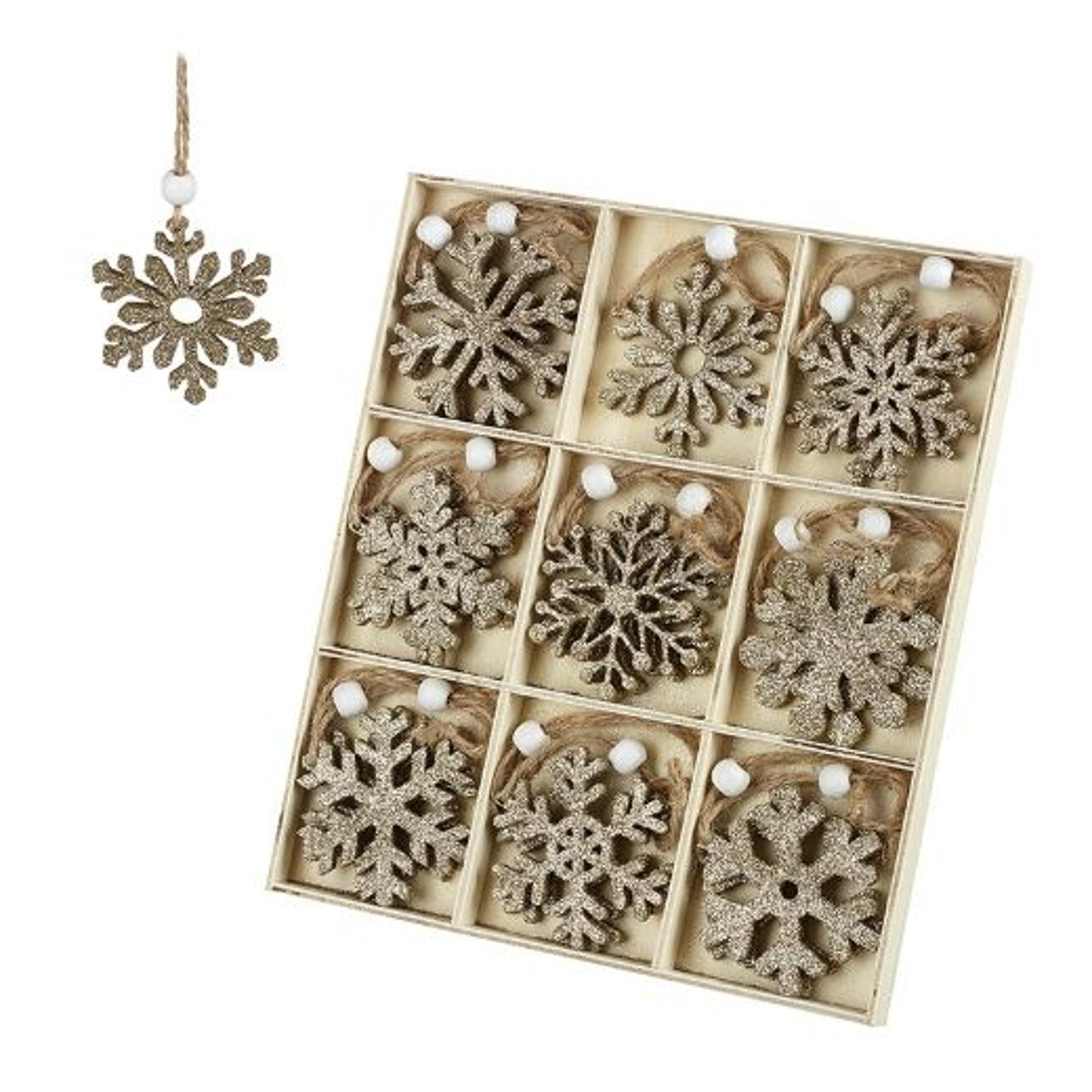 Christmas Tree Decoration: Wood Snowflake Glitter Small Cut Out - Assorted Designs - Natural Gold