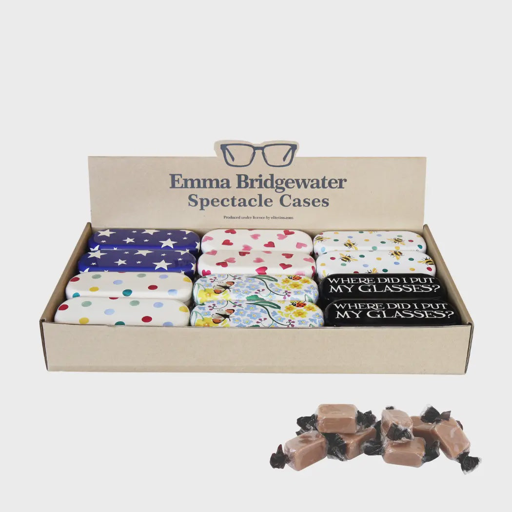 The Emma Bridgewater Tin Glasses Cases come in six assorted designs, each containing delicious fudge. Perfect for keeping your glasses safe or gifting, these stylish cases combine practicality with the charm of Emma Bridgewater's artwork.