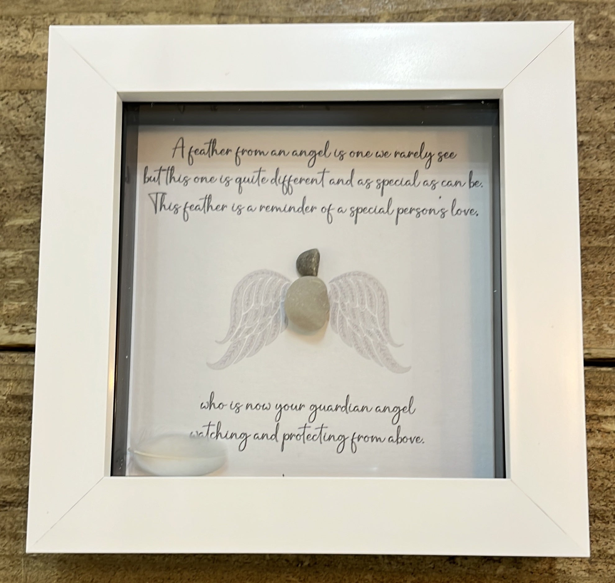 Pebble Picture: Memorial Guardian Angel  - 'A feather from an angel' Poem - White Box Frame - La de Da Living